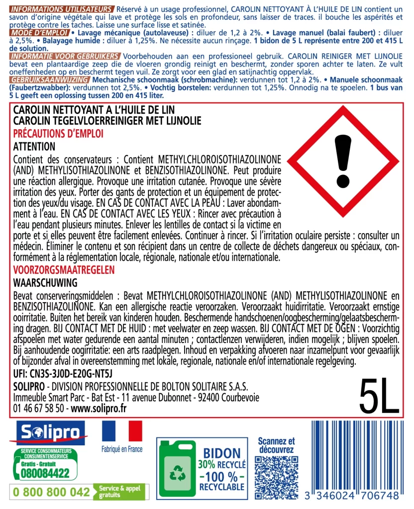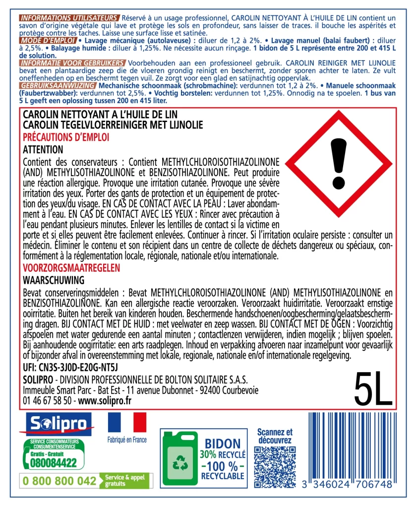 Conçu pour un usage professionnel, Carolin Professionnel Nettoyant à l’Huile de Lin assure un nettoyage en profondeur et une protection durable, parfait pour les environnements exigeants où propreté et entretien optimal des surfaces sont essentiels. Réservé à un usage professionnel. Fabriqué en France.