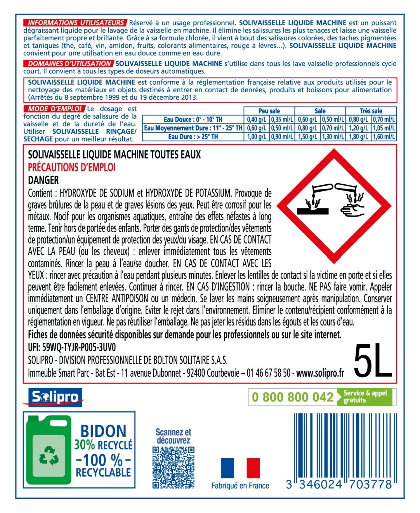 Solivaisselle Liquide machine Toutes Eaux est spécialement conçu pour le lavage de la vaisselle en machine professionnelle monobac, à capot, etc. Solivaisselle Liquide machine Toutes eaux contient des agents très dégraissants qui éliminent toutes les salissures et un désinfectant chloré qui assainit la vaisselle.