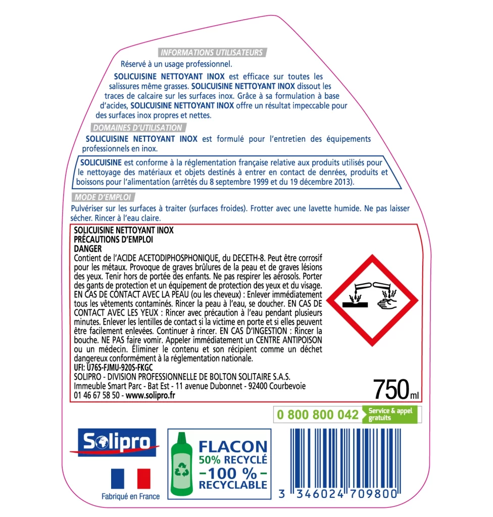 Solicuisine nettoyant inox élimine toutes les salissures des surfaces, appareils et matériels inox. Solicuisine nettoyant inox dissout le calcaire et les traces laissées par l’eau. Il redonne un brillant aux surfaces traitées et ne raye pas. Réservé à un usage professionnel. Fabriqué en France.
